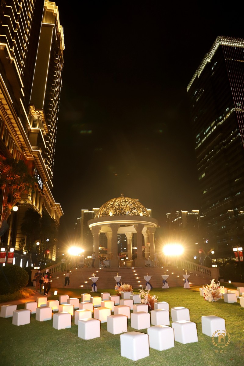 顺着罗曼桥步入独具异国风情的罗马亭,台上放置着工作人员早已准备好的月饼点心等特色美食佳肴以及香槟美酒,供宾客们品尝。